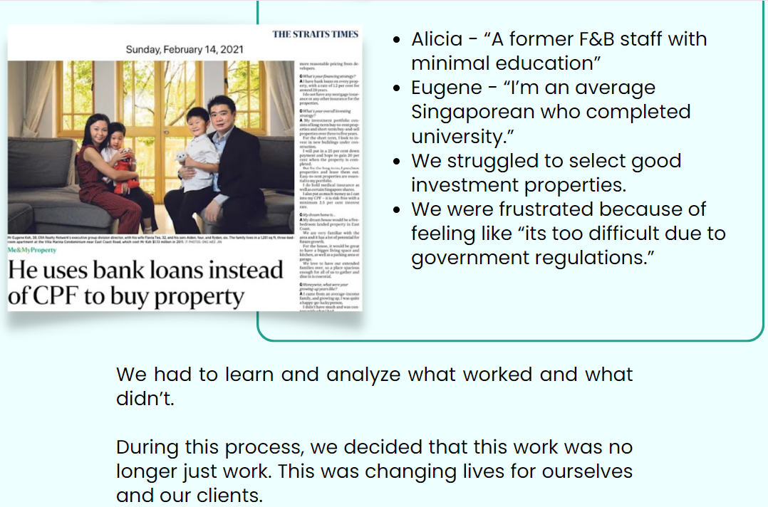 He is presented on stage and is a featured speaker on multiple nationwide platforms, including the Singapore Property Show hosted by 99.co, Virtual Property Expo by PropertyGuru, and the Singapore Property Weekend by ERA.